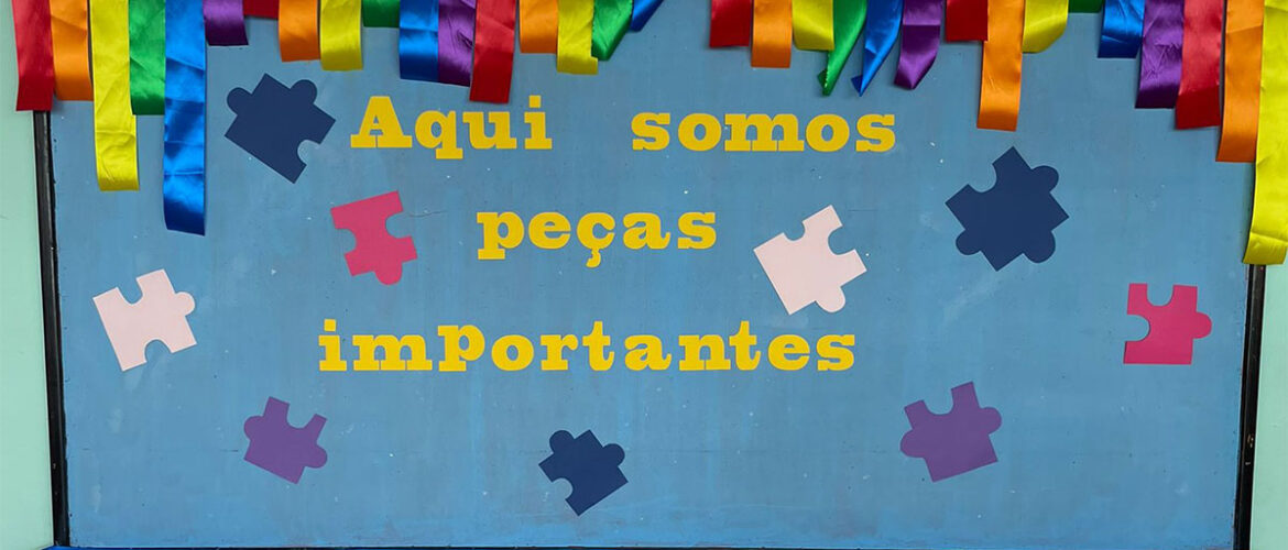 Na entrada da creche e do pré-escolar, encontra-se a frase “Aqui somos peças importantes”, e no CATL, “Aqui somos todes importantes”, feito com material reciclado e reutilizado.